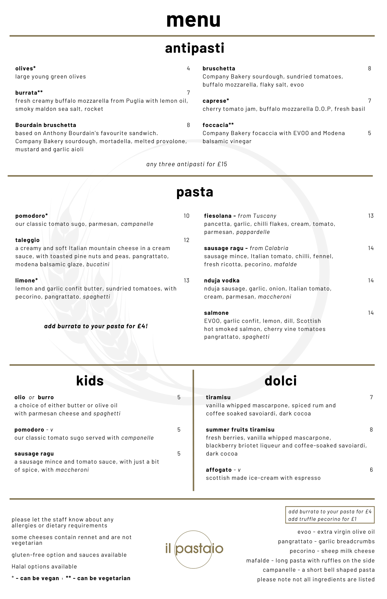 Our recipes, sourced and curated by our head chef, are aimed to represent dishes and flavours that are not normally seen Italian restaurants found in the UK, whether they are truly authentic, or twisted slightly to use what we have seasonally available in the UK or Italy